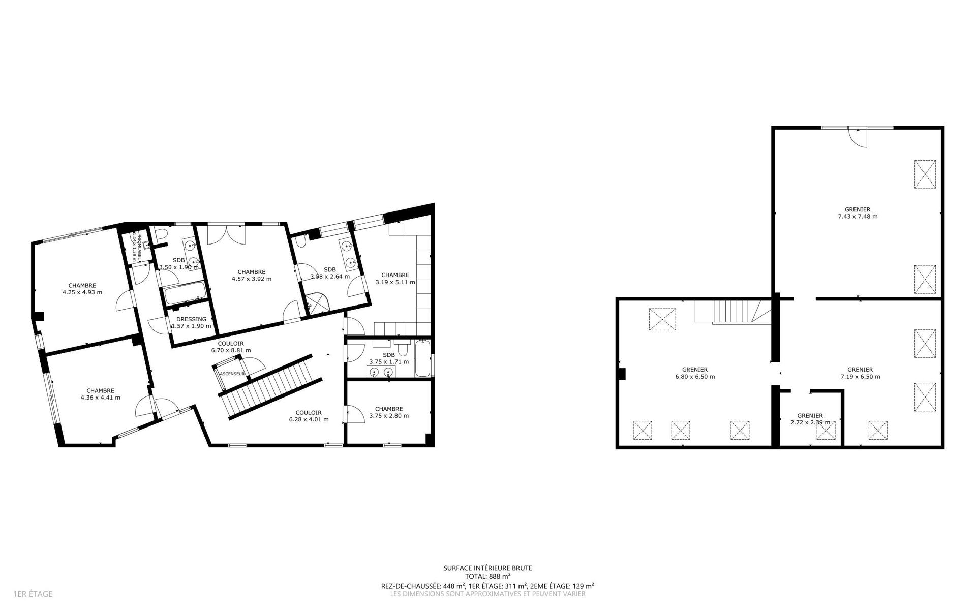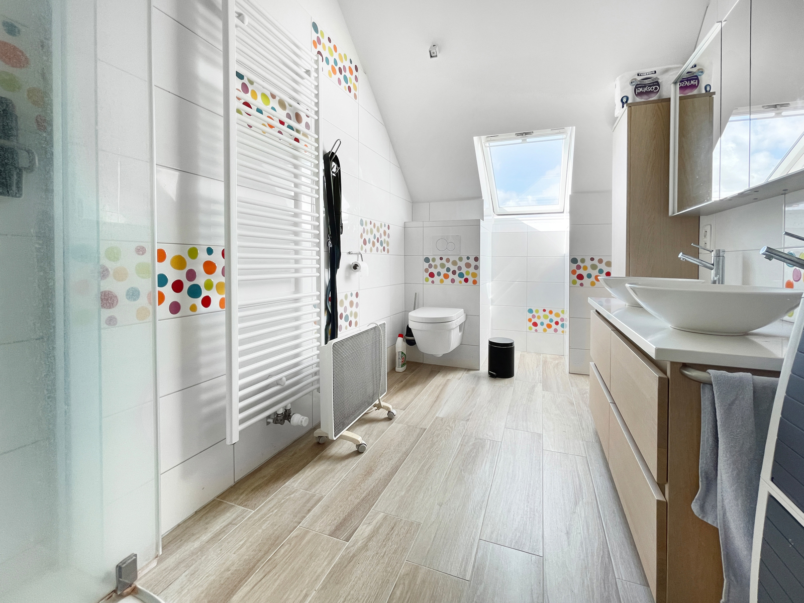 Hall de nuit, 5 chambres, 2 salles de bains et une salle de douche (avec WC), WC indépendant.