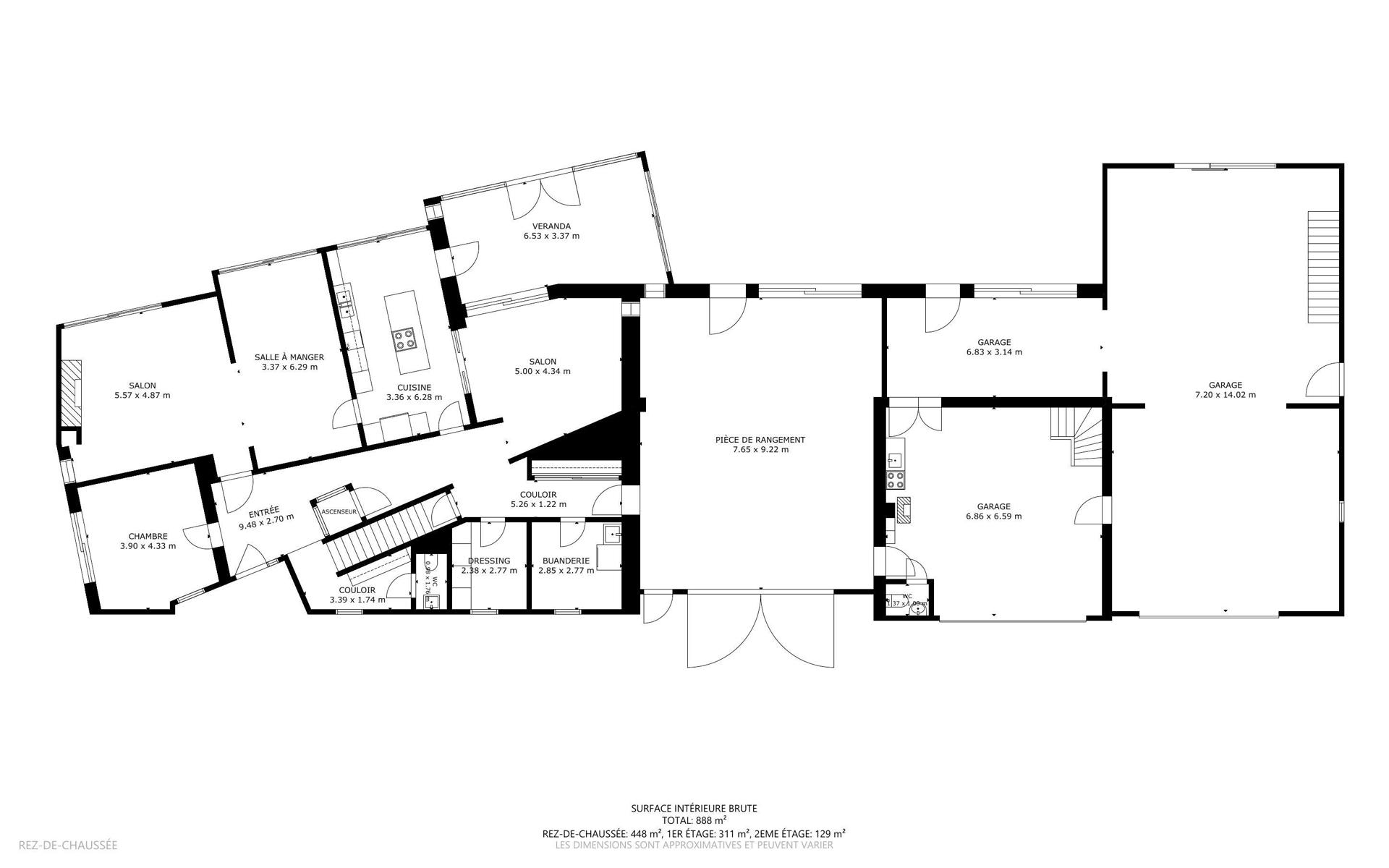Hall d’entrée avec vestiaire, salon/salle-à -manger, cuisine ouverte hyper-équipée, petit salon, buanderie, réserve et WC, espace jardin d'hiver fermé